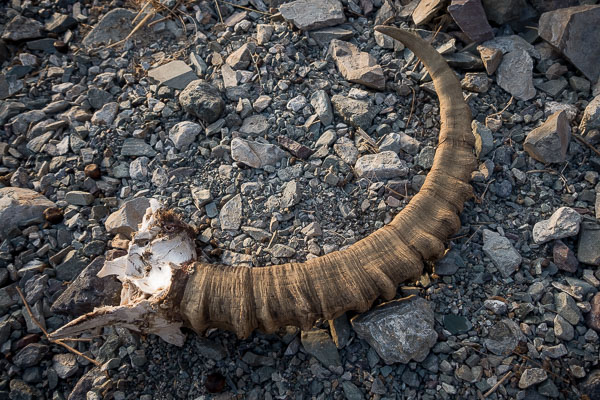 We left early, stayed late, and looked, especially Davaa, very hard. Although we saw prints in fresh snow, scat that was recently buried, the stripped hide from a recent kill, and the familiar odor of cat spray left to mark its territory, we joined the club of those who did not see a snow leopard. We did see argali sheep and ibex, and protected territory that, even in Mongolia, is free of litter. On this afternoon in late March we found our way down the mountain and back to the car by way of a frozen stream, descended the dry bed of a river at dusk, and wound our way around Jargalant's gravelly base, toward our home for the night, in the dark.
