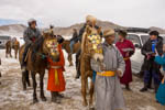 On this first race of the season, spring was just around the corner as light snow lingered on the ground. The race course is a ten kilometer one-way route that is all uphill, across the sand and rock desert that spans most of the western view from downtown Khovd. Registration is somewhere downhill of the halfway point in the race, so when they are ready, riders and horses make their way the three or so miles to the starting line. If there is a minimum size or age for the riders I could not tell what it was. The strategy seems to be