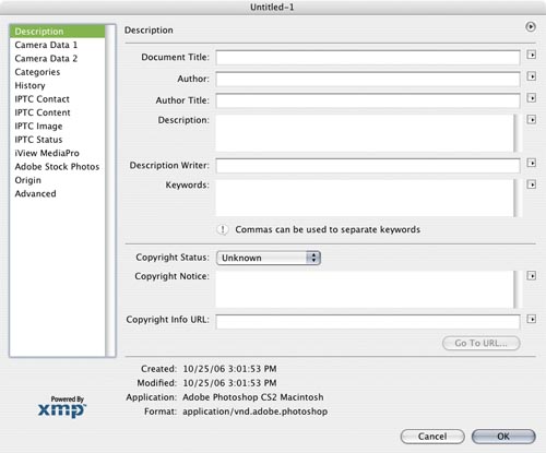 From Photoshop, create a new empty document from scratch. If you go to File > File Info, you will be starting here: |