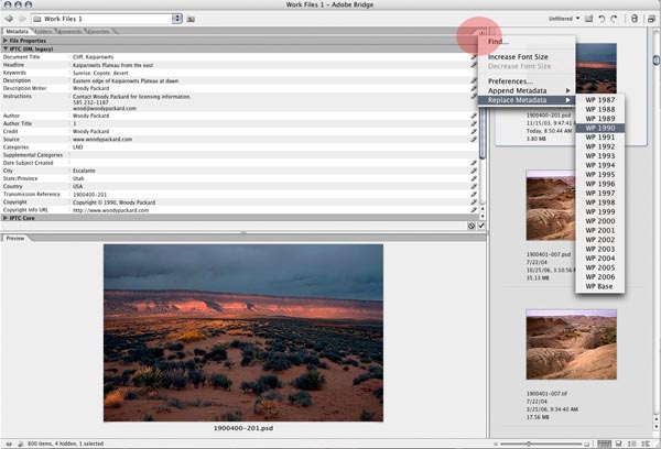 Using Your Metadata Templates To use your metadata template in Bridge, select the image or images you'd like to tag and go to Tools > Replace Metadata or Append Metadata and choose the template you saved. You can also do this by accessing the choices from this spot: |
