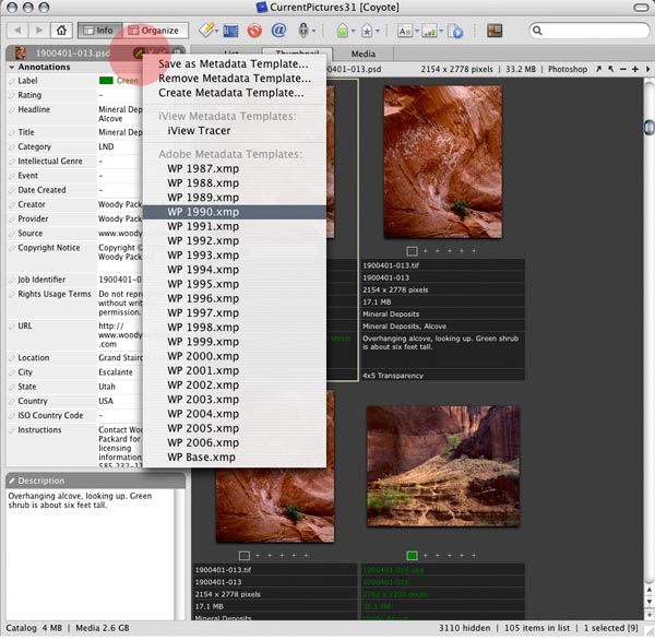 iView makes a point of playing nicely with Adobe applications. You can use the metadata templates that you set up in Photoshop, and you can create templates in iView that Adobe applications can use. Access this when you are in Info mode (not Organize mode) here: ![]() |