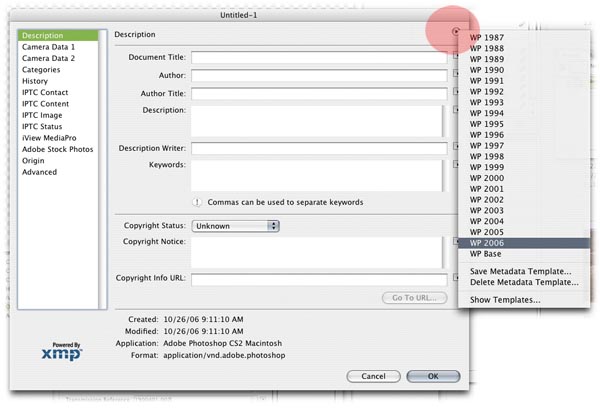 To apply your Metadata Template information from Photoshop, you will do it one image at a time through the File > File Info dialog box, accessing your list of templates the same way you saved them. Choose the template you need: ![]() |
